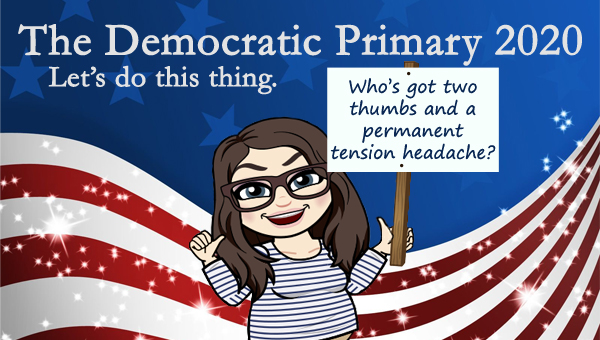 image of a cartoon version of me grinning and pointing at myself with my thumbs while holding a sign reading, 'Who's got two thumbs and a permanent tension headache?', pictured in front of a patriotic stars-and-stripes graphic, to which I've added text reading: 'The Democratic Primary 2020: Let's do this thing.'