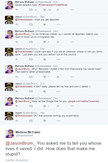 Me: Saved people's lives. #ObamacareInThreeWordsSo, because I stated the indisputable fact that Obamacare has saved people's lives, I got told I should be deported, that I'm a dumb dyke, that I'm autistic, and that I'm a stupid dyke.