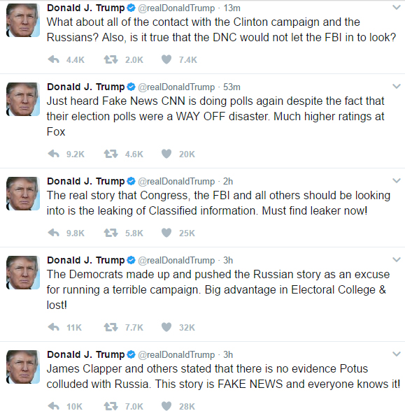 Intell hearing today - bottom lines so far: 1)Trump campaign under investigation and 2)Trump tweets about Obama are bogus.